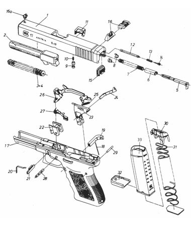 A Glock fegyverek tervezésénél sikerült az alkatrészek számát egy konvencionális pisztoly alkatrész számának kb. a felére redukálni. A pisztoly alkatrészei között nem találunk csavarokat és zégergyűrüket. Az utóbbi alkatrészek meglazulása és törése okozza többnyire a működési zavart. A szét és összeszerelést egy darab szerszámmal, ütés és kocogtatás nélkül lehet elvégezni. A modell válasz-ték alkatrészeinek közel 70%-a kompatibilis! Az alábbi ábrákon lehet összehasonlitani, és bizonyítani, a Glock fegyverek karbantartás igénye, a szervíz és képzés költsége, töredéke egyéb fegyverekének. Az egyszerű felépítést ezen a linken tudjuk tanulmányozni. A hüvelyvonón a töltöttség is ellenőrizhető szemrevételezéssel és tapintással is.